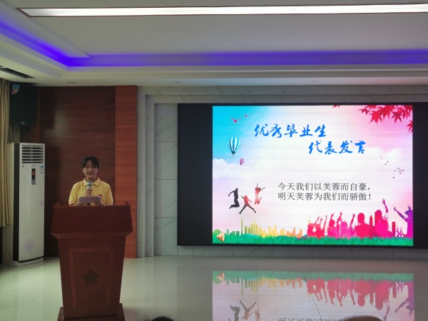 接着,进行优秀毕业生表彰。在《毕业歌》声中,优秀毕业生迈着自信的步伐,走上了颁奖台,学校领导为其颁发了证书及合影留念。随后,优秀学生代表和家长代表用自己真挚的语言满怀深情地表达了对学校及老师们的感激之情。