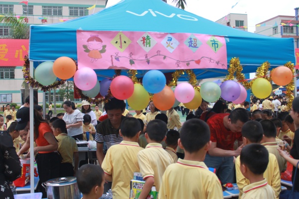 31日下午,义卖活动在《爱的奉献》歌曲声中拉开序幕,同学们将自己闲置的学习用品、书籍、毛绒玩具、手工艺品、手工制作饰品、个人创作的书画作品等纷纷捐献出来义卖。展台、义卖海报布置得五彩缤纷:“义卖有价,爱心无价”、“因为有爱作音符,美好生活能共谱!”整个校园充满了浓浓的爱意。学生们脸上挂着灿烂的笑容,在热闹的气氛中庆祝自己的节日。在老师和家长的组织引导下,孩子们分工合作,互相选购,买自己喜欢的物品,献出自己的爱心,整个现场热情似火,每个家长和孩子的脸上都洋溢着收获的喜悦。