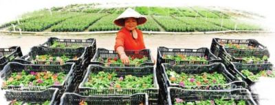 横栏镇六沙村花木场,花农在整理鲜花。
