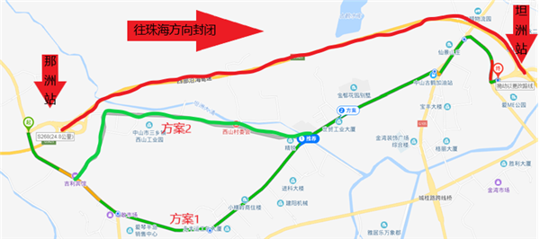 绕行路线:江门往中山、广州方向车辆,从坦洲收费站出→右转进入广珠大道→导航进入那洲收费站。