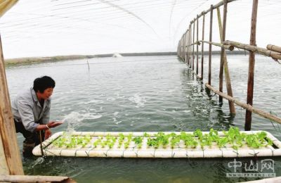 世和马友鱼养殖基地,鱼塘护理员在护理水培蔬菜。本报记者 余兆宇 摄