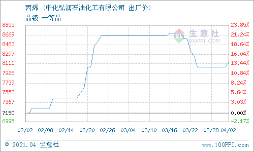 4月2日,中化弘润石油化工有限公司丙烯报价上调,涨100元/吨至8150元/吨。