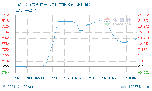 4月2日,山东金诚石化集团有限公司丙烯最新报价上调,涨70元/吨至7950元/吨。