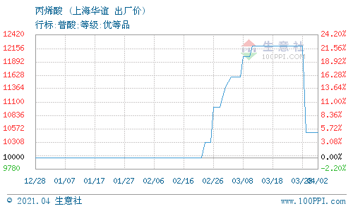 4月2日,上海华谊丙烯酸最新报价(华东送到)在10500元/吨,较上一交易日相比持平,实际成交价以协商为主。