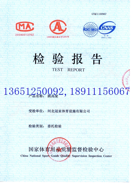 立柱应垂直场面,垂直公差不大于1/800,其高度刻度应精确、清晰,两立柱高度刻度应对称;跳高架应超过横杆实际提升高度100mm;横杆采用不易折断的玻璃钢纤维材料制成;除两端外,横杆横截面是圆形,横杆颜色醒目,表面无毛刺,所有棱边和尖角半径6mm;横杆固定在立杆上,中心自然下垂20mm;横杆托能牢固地固定在立柱的刻度内,横杆托上没有包裹橡胶或其他能够增大与横杆之间摩擦力的任何物质,亦没有使用任何各类的弹簧,进行跳高运动时,碰触横杆,横杆容易掉下。