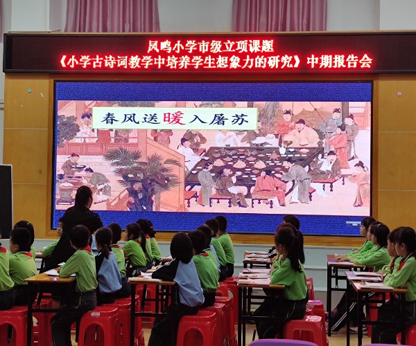 课题组成员黄晓燕老师进行了《元日》古诗课例展示,凤鸣小学学生带来了精彩的古诗系列表演《游子吟》及《望月》。接着,课题主持人刘苑老师作了课题中期报告。在报告中,刘苑老师从教材、语文课程标准、学校教学现状等方面介绍了课题的实施背景。接着,刘老师重点介绍了课题的运行情况,前期在学校的支持和专家的指导下,课题取得了阶段性成果:教师在古诗词方面的教研能力得到了提升,在学生古诗词想象力培养方面也取得了一定成效,但仍存在研究深度和广度不够、课外延伸性活动不多、评价方式不及时等问题。