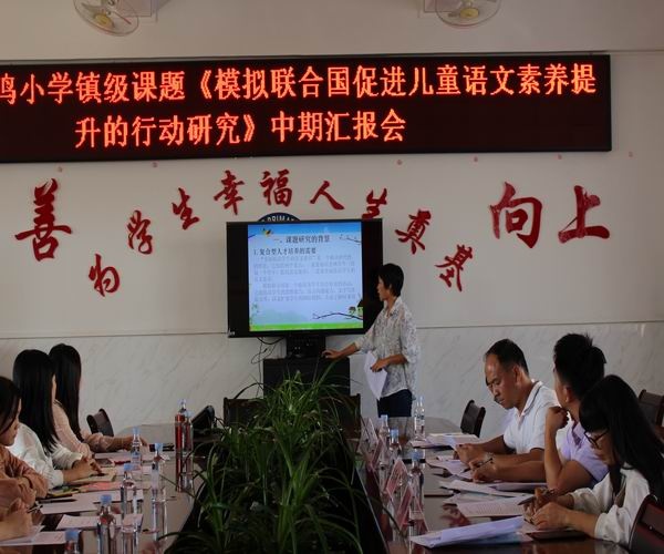 11月12日,凤鸣小学举行镇级课题《模拟联合国促进儿童语文素养提升的行动研究》中期汇报会,东凤镇课题专家组的林红主任、陈名胜主任、何中建主任、陈簿新主任,凤鸣小学吴桂凤副主任以及课题组全体成员参加本次会议。