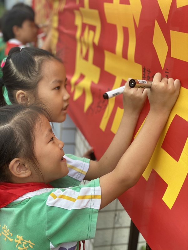 启动仪式第三项,师生代表在横幅上签名。他们在横幅上一笔一划认真地写着名字,心中装满了对阅读的向往。本次读书活动启动仪式在校长艾时胤先生、邓亮副校长的带领下,教师代表和学生代表一起签名中结束了这场书籍的盛宴。