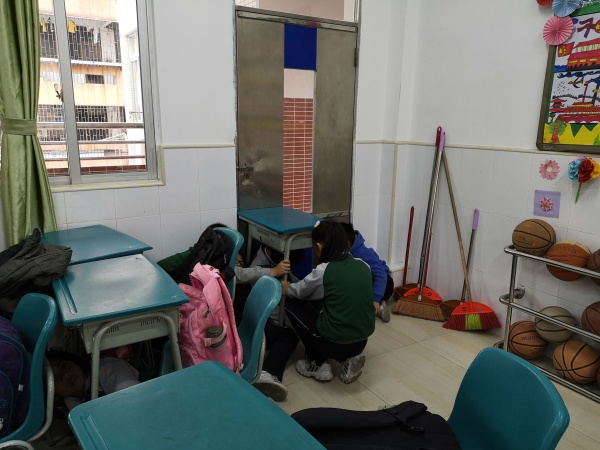 广播提示完毕,教师们迅速组织还在室外的学生返回教室或其他紧急避险场所。随后马上指挥学生紧闭门窗,拉上窗帘并关灯,用课桌、木柜顶住门窗,防止“暴恐分子”破门窗而入。紧接着各班学生自觉快速地躲到桌子下方,安静等待。