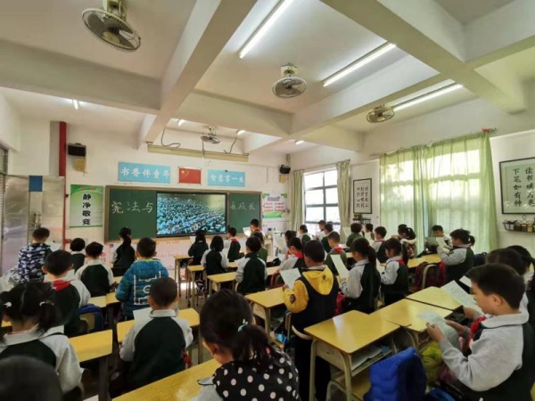 宪法学习的第一部曲是在班级晨读时间和全市中小学生一起进行宪法诵读:“红旗长扬,星空体育迎着朝阳。成长路上,聆听宪法雄壮的声响……”。第二部曲是在晨读之后,歌唱《宪法伴星空体育成长》歌曲。第三部曲是下午进行的法治宣传与教育,全校师生共同观看法治视频,聆听凯行律师事务所的梁育律师讲解宪法。