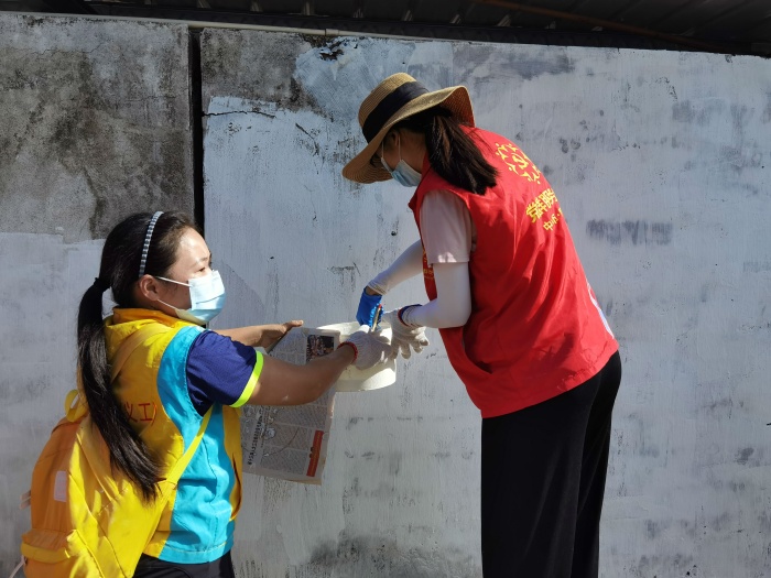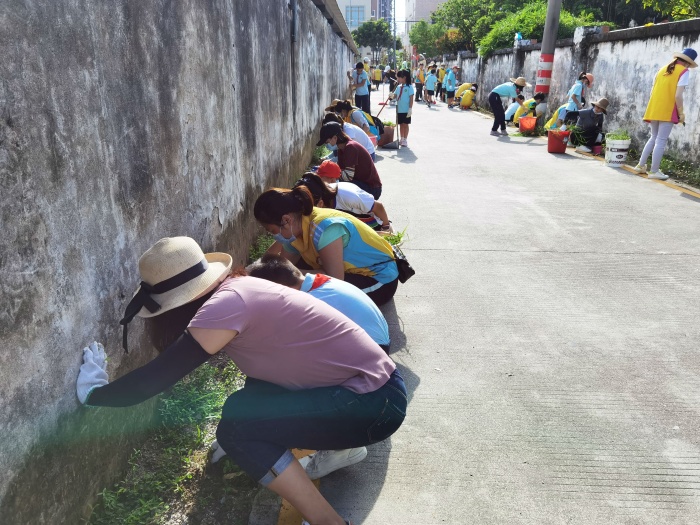活动开始后,大家集中在学校侧门,看见学校围墙外的杂草和垃圾,就自发地拿起扫把和铲子,年龄小一点的孩子还主动用双手捡起垃圾,不一会儿,围墙外的地面就变得干干净净。当知道可以开始粉刷围墙时,孩子们立刻拿出自己带的小桶,拿起刷子蘸着粉浆开始刷墙,家长们在一旁指导孩子们的动作,让孩子们感受劳动的乐趣。老师们也拿起滚筒刷,为美化校园围墙出一份力。在劳动过程中,全体志愿者明确分工,积极合作,干得热火朝天!大家人人动手,不怕脏,不怕累,光秃秃的学校围墙很快就变得洁白干净。