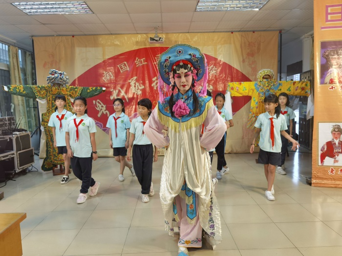 粤剧是岭南的文化瑰宝,粤剧文化历史悠久。表演一开场,主持人先向孩子们介绍了粤剧中行当,展示出了“生”和“旦”的服装以及图片,让学生们对粤剧表演产生极大的兴趣。本次活动一共表演了三个片段,其中“天女散花”的片段,演员华丽的动作、专业的唱腔,让学生连连拍手叫好。还邀请了同学们上台和演员老师一起学习“生”和“旦”的经典亮相动作,孩子们都拿出了“十二分认真”的劲,演员老师耐心地纠正孩子们不到位的地方,在最后的展示中也赢得了台下小观众们的掌声。“粤剧进校园”能拓宽学生的视野,培养学生向善、向美、向真,扩大学生的知识面,加深学生对粤剧的了解,从而达到弘扬粤剧文化的目的。