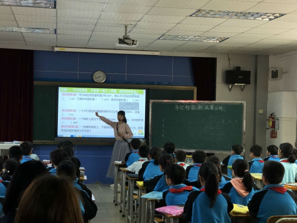 活动首先由陈芳兰老师带领五(1)班的孩子结合一体机和希沃软件的使用上了一节精彩的复习课,结合多边形面积的练习开展授课。陈老师以小组自治、合作纠错引入,引导学生回忆单元知识,建立知识框架。其次的师生一同总结单元错题原因:第一,不注意单位,不会举一反三;第二,没有沟通好图形之间的练习;第三,读题能力弱,找数据不准;第四,不会借助图形结合解决问题。随后陈老师逐一问题结合练习攻破,帮助学生巩固知识。在课堂上,学生真正成为学习的主人,积极参与教学的每一个环节,努力地探索解决问题的方法,大胆地发表自己的观点。在评课议课环节,评课老师表示通过小组合作学习,学生思维得到锻炼和发展。