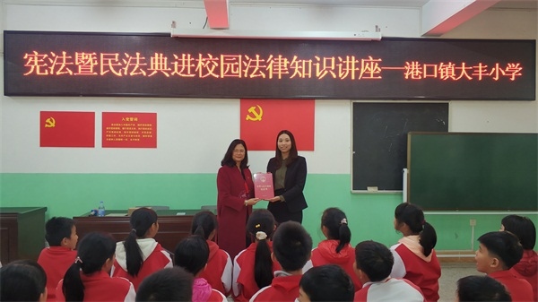12月4日早上,各班在班主任的带领下观看了青少年普法网的“宪法晨读”直播活动,并了解了“最高检常务副检察长讲法制课”的内容。随后,各班级还开展了全体学生进行宪法晨读活动以及学习唱响《宪法伴我成长》歌曲活动。当天下午,大丰小学邀请了林文理律师为师生们开展“宪法暨民法典进校园”的法律知识讲座。讲座围绕“尊崇宪法”、“案例学法(民法典)”、“法律诵读”三部分内容展开。在“案例学法”的环节中,学生们积极踊跃发言,各抒己见,该环节展现出大丰学子较强的法律意识。讲座尾声,林文理律师赠送给大丰小学一本《中华人民共和国民法典》,活动就此顺利结束。