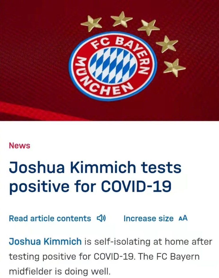 德甲拜仁慕尼黑俱乐部发布公告称,球员基米希、舒波·莫廷在新冠病毒检测中结果呈阳性,目前各自居家隔离,身体状况正常。