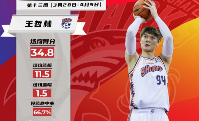 上海内线核心王哲林在第13周出战4场,率队取得3胜1负的战绩,他场均出场36分钟,贡献出34.8分、11.5篮板、1.5盖帽的优质数据,投篮命中率高达66.7%,并且在常规赛收官战面对北控,拿下创CBA本土球员历史第二高纪录的61分。