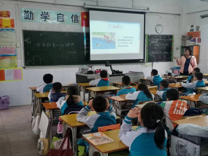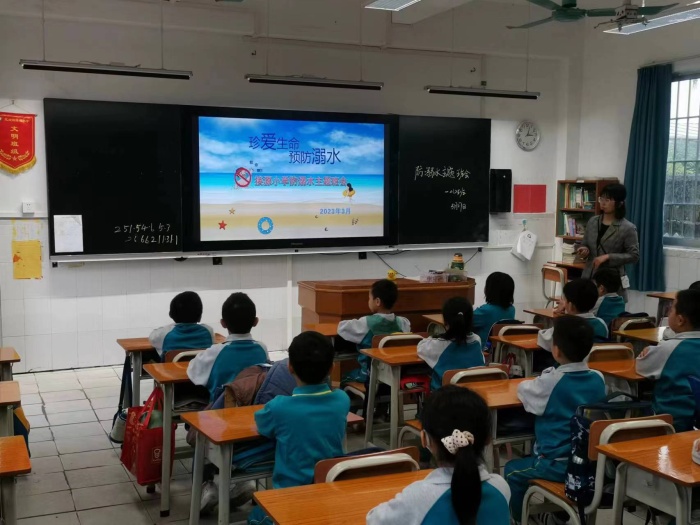 班队课上各中队辅导员先通过课件介绍了溺水常见的五个原因:在水边玩耍,下水摸鱼,捡落入水中的物品;游泳时抽筋或在水中打闹;到井边打水不慎落入井中;雨天掉入沟坑;暴雨来临时无躲避处所等。接着,针对以上问题辅导员们向同学们提出了预防溺水六不准的措施:不准私自下水游泳;不准擅自与他人结伴游泳;不准在无家长或教师带队的情况下游泳;不准到不熟悉的水域游泳;不准到无安全设施、无救护人员的水域游泳;不熟悉水性的孩子不擅自下水施救,尤其是在遇到同伴溺水时避免手拉手盲目施救,要智慧救援,立即寻求成人帮助。最后,辅导员通过视频播放近几年来各地出现的溺水事件,给同学们敲响警钟,还向家长们发放了防溺水安全责任书和承诺书实现家校共管。