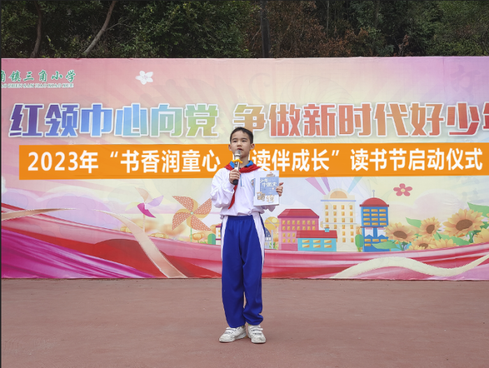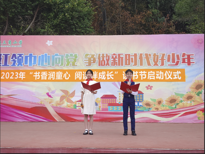 启动仪式第二项,由三角小学副校长黄丽娟宣读《三角镇三角小学2023年“书香润童心,阅读伴成长”读书节活动方案》。黄副校长向全体同学发出倡议,号召同学们积极参加读书节的各项活动,将知识运用到学习及生活当中,努力做到知行合一。