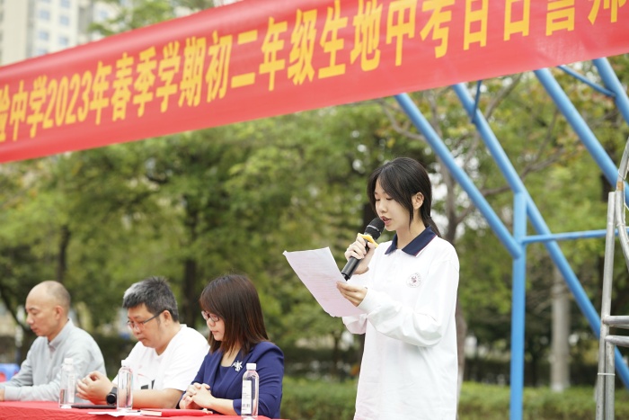 学生代表邓玉彤同学认为备战生地中考的关键在于树立目标,坚定信心,努力奋斗和及时改进学习方法。她坚信初二学子必能以高昂的斗志、百倍的信心、扎实的基础,逐鹿考场,笑傲六月。