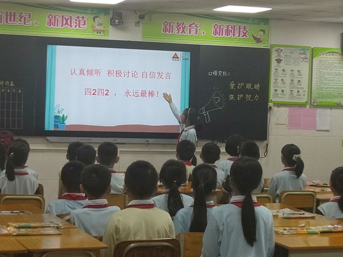 在课堂上,陈老师教态自然大方,通过目标导向,让学生明确学习目标。接着通过视频导入、课前调查分析、小组合作讨论,小组上台展示,课堂知识拓展等环节教学。陈老师的课堂设计有梯度,由易到难,使学生更好地接受知识。通过交际训练,学生能说出影响视力的原因、保护视力的措施,突出了口语交际训练的本色。课堂中班长担任小老师,老师从旁指导,师生与生生间精彩的互动交流将课堂氛围推向高潮。