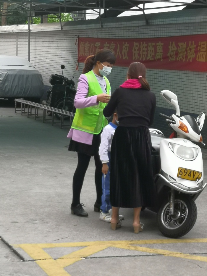 在学生人流量最大的时候,守在东门两侧的家长还会引导学生们排好队,有序地测量体温,然后进入校园。当看到孩子的服装不整齐时,会及时地提醒孩子整理好自己的仪容仪表,提醒没有佩戴红领巾的孩子及时佩戴好红领巾。
