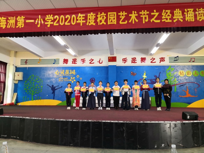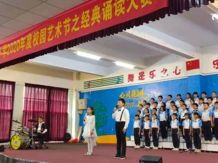 12月24日下午,海洲第一小学四到六年级全体师生齐聚礼堂,举行了“2020年度校园艺术节之经典诵读大赛”。这次比赛,风格多样,内容丰富多彩,诗词歌赋精彩纷呈,既有韵味十足的吟诵表演,也有动感十足的歌曲演唱,还有慷慨激昂的诗词朗诵。其中,四(4)班的孩子们在舞台上呈现了家喻户晓、妇孺皆知的《春晓》一诗。该节目在编排上有多处亮点:首先由两位领诵者介绍唐诗和孟浩然,然后带领全班同学声情并茂地进行诗朗诵,最后全班演唱由音乐家谷建芬老师作曲的风格欢快、活泼的歌曲《春晓》。在语文老师的精心编排下,演唱形式交替变幻,有领唱与合唱及齐唱,配上任纪霖同学的爵士鼓,黄致远同学的钢琴伴奏,这是多种声音适当配合的听觉享受。同时,舞台上队形队列的变换与服装点缀所产生的效果,也是美美的视觉享受。