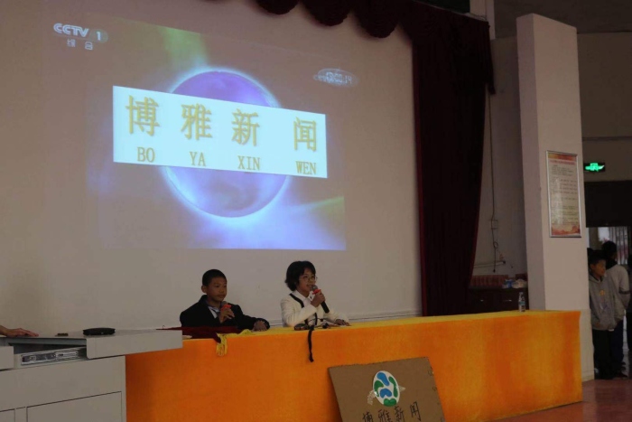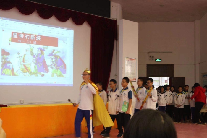 初一五班为同学们带来的是语文短剧《狼》。原本是一个小短剧,通过同学们的二次创作,加入了狼吃人、众人悬赏的的情节,让这部短剧的情节更加的丰富,人物形象更加丰满,一五班的用心演绎获得了阵阵掌声和喝彩。初一六班演出的是英语剧目《狐假虎威》。同学们的口语准确流畅,背景音乐和图片与节目环环相扣,契合主题,关键语句还有字幕提示,让观众们身历其境仿佛进入到了动物的世界。初一四班带来的是原创作品《博雅新闻》。同学们从自身的校园生活入手,在学习生活中采集素材融入剧本,讲述了他们一天学习生活中的苦与乐。这种感同身受的情节引得观众们不由得会心一笑,把最热烈的掌声送给初一四班。初一二班的节目是可爱又机智的《小红帽》,。小红帽机智又勇敢,还有班主任佳宁老师扮演的老爷爷,老爷爷因为老眼昏花成功的成了大灰狼的帮凶。初一七班的《皇帝的新装》里,可爱的朱嘉琪老师扮演一个被皇帝新装帅晕的姑娘,成功逗得学生们哈哈大笑。还有《幸福是什么》《若一切只如初见》等节目。