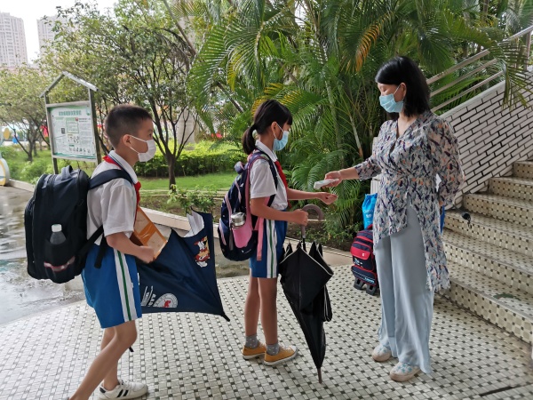 清晨,学校行政跟值日老师们早早来到了校门口,满怀期待等待着孩子们的归来。全校师生严格遵守疫情防控要求,错时错峰入校,家长志愿者帮忙维持秩序,学生间隔一米排队到达校门口后,值日教师认真引导学生有序经过自动测温仪,随后按照规定路线依次进入班级,严把校园入口关。各班班主任在班级门口等待学生,为学生进行手部杀菌,登记体温,细抓班级通行口。整个过程一步不差,规范有序。