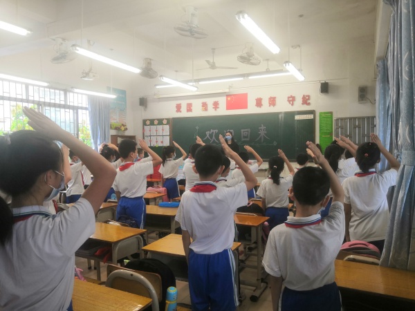 各班班主任在班内开展开学第一课的专题教育,主要是以培养学生的爱国主义情怀为总基调,讲述战役事迹,普及防疫知识,重视学生疫情后心理疏导。根据要求,课间要尽量减少相互之间的接触,孩子们自觉地呆在教室里休息、活动;走廊里一派安静,来往的学生轻声慢步,列队而行,非常有序。随后,学生开始做放松操,舒活筋骨,抖擞精神,为复学第一天增添活力。
