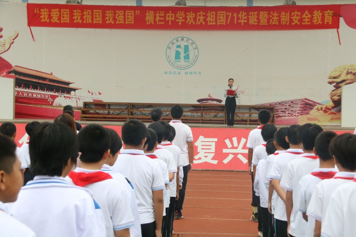 为了庆祝伟大祖国母亲的生日,同时也为了能让全体师生过一个平安、愉快的国庆小长假,9月28日,横栏中学全体师生集中运动场,举行了“我爱国,我报国,我强国”欢庆祖国71华诞暨法制安全教育活动。