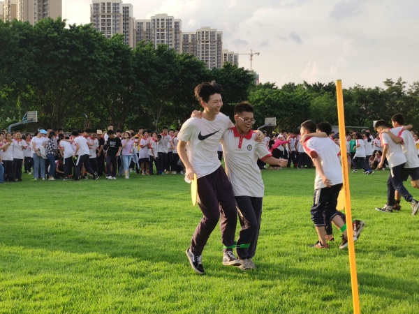 接着,进行二人三足迎面接力赛,每个班级选取10位男同学,10位女同学代表班级进行比赛,最快到达终点的班级获胜。随着哨声吹响,同学们便开始奋力冲刺,有的同学健步如飞,有的同学寸步难行,还有的同学步调不一,不慎摔倒,但是,他们没有就此放弃,而是迅速爬起,重新调整队形,继续追赶对手。此时的同学们都将学习的压力抛诸脑后,玩得不亦乐乎。