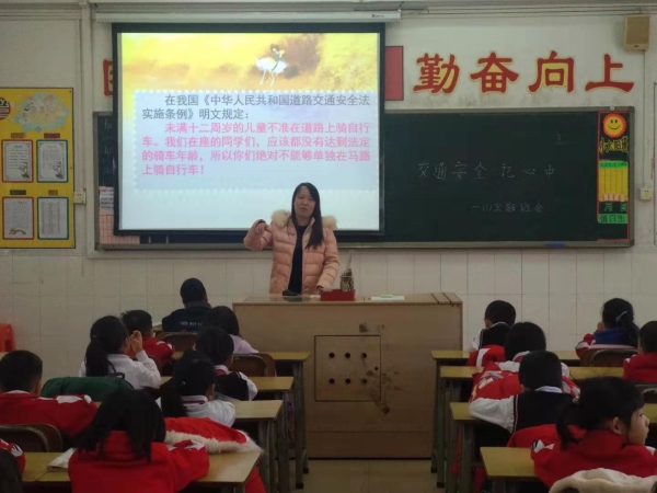 在班会课上,各班主任老师从学生行走安全、骑车安全、乘车安全等方面对学生进行交通安全教育。通过视频图片等形式,以直观的方式,让学生懂得了过马路时一定要走人行横道线、要遵守交通信号灯、行人靠右走、不能在马路上玩耍等。学生都听得十分认真,并表示牢记在心。