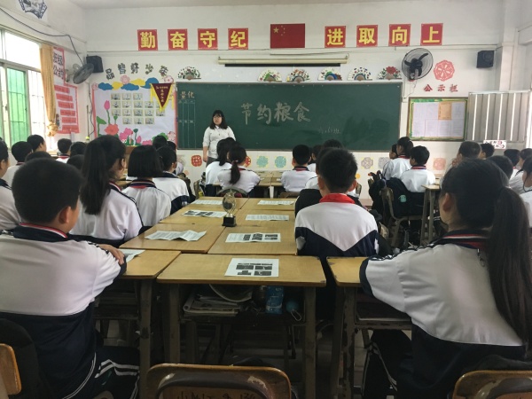 “谁知盘中餐、粒粒皆辛苦。”随着背诵这首耳熟能详的古诗,各班主任将学生们引入了本次班会的主题。主题班会上,班主任采用幻灯片图文并茂地介绍了我国的耕地以及人口和粮食情况,让学生观看了国内外缺粮和饥荒地区的国家状况,直观的数字引起了学生们心灵的震撼和情感上的认同;接着由两名同学给大家讲了关于勤俭节约的小故事;在讨论环节中学生们联系自己的生活实际,对节约和浪费粮食的现象进行了交流、汇报,进一步明确了爱惜粮食、节约粮食的特殊意义;最后的情景剧表演将班会的主题推向了高潮,在生动、有趣的表演中学生们明白了粮食在生活中的重要性,学生纷纷表示要从现在做起,拿出实际行动,爱惜粮食、节约粮食。