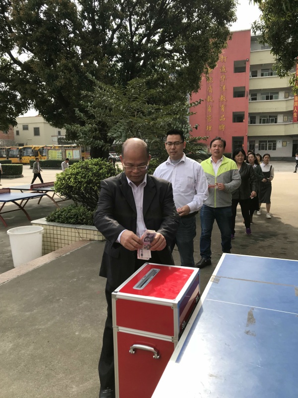 上午9点55分爱心捐款活动如时进行。艾主任主持用一段充满真情的开场白宣布捐款活动开始。接着,在《爱的奉献》那优美的旋律中,黄圃华洋学校全体行政、老师们带头献出自己的一份爱心。在学校行政和老师们的爱心捐款行为的影响下,黄圃华洋学校两千多名学生也以班级为单位,各班班长代表上台将一个个沉甸甸的、汇聚全班同学爱心的信封放进捐款箱,台下一双双真挚的眼神和连绵不断的响亮掌声,也在表达爱、传递爱。大家用自己的实际行动诠释了一份奉献,一份感恩。