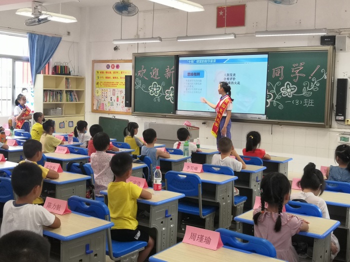 在校园宣传大使的引领下,孩子们来到班级到指定位置就坐,爸爸妈妈们离开孩子参加新生家长培训。待正副班主任清点完人数后,由校园宣传大使进行校园一日常规和十有课堂等规范进行宣讲。紧接着,孩子们排好队伍,宣传大使带领小朋友们熟悉校园。