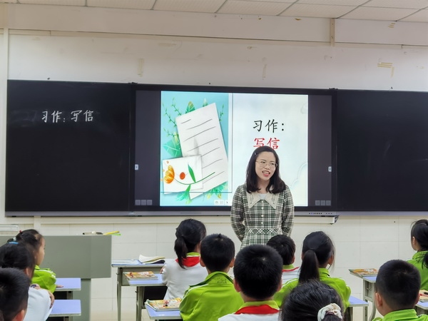彭楚婷老师执教的《习作·书信》则向大家展示了一堂扎实的习作教学课应有的范式。学生在范例中掌握书信格式,在儿歌中熟练书信特点,在情境中练习。彭老师简洁的语言与她干脆利落的课堂教学设计,让与会老师们为她点赞。
