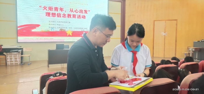 2020年是中国少年先锋队建队71周年,为了进一步激发新时代少先队员、共青团员的爱国热情,树立远大理想,培养优良品德,积极践行社会主义核心价值观,11月9日下午,由开发区团工委主办、同益社工承办的“火炬青年,从心出发”理想信念主题教育活动在火炬二中学术报告厅顺利开展。