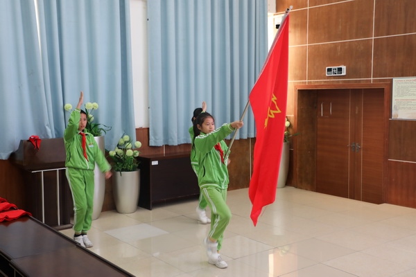 伴随着嘹亮的出队旗曲,旗手和护旗手们迈着整齐、铿锵有力的步伐出场。紧接着,全体队员起立,高唱队歌,新队员们精神饱满,歌声洪亮,唱出了心中的自豪和对少先队组织的无比热爱。少先队大队长王敏乔同学宣读完新队员名单后,六年级优秀少先队员代表为新队员戴上了鲜艳的红领巾。戴上红领巾的新队员们个个精神抖擞,脸上洋溢着幸福和自豪的笑容。在副大队长赵梓默的带领下,新队员们在队旗下庄严宣誓,老队员重温入队誓词。宣誓结束后,少先队总辅导员杜沁源老师讲话,她对新队员们加入少先队组织表示祝贺并提出了殷切的希望,希望新队员们在星星火炬旗帜的指引下,踏着先辈的足迹,以严格的标准规范自己的行为,努力学习,勇敢前进,学会感恩,珍惜生命,牢记自己的光荣使命。最后,全体队员在杜老师的带领下齐声呼号。