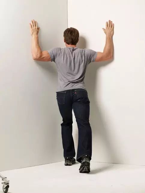 以胸部上升动作为基础,头部稍微前倾,就像做出点头的动作,直至感觉到头部以下与颈部交界处的拉伸感觉。保持10秒钟,放松一下,接着重复5到10次。 墙角胸部拉伸运动