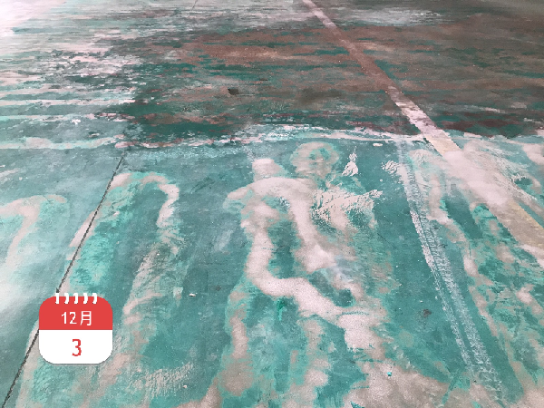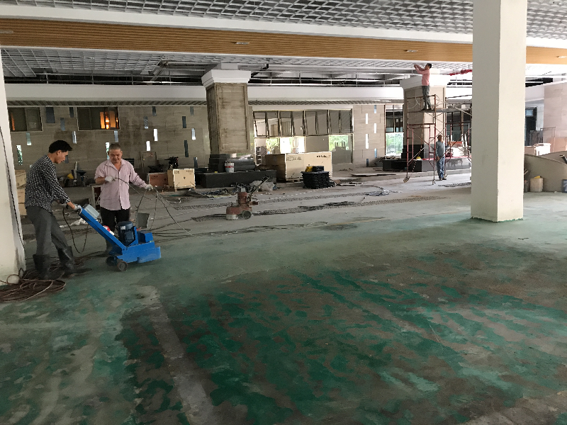 接到任务后,马上查看现场:现有场地以前是一个售楼部的大巴停车场,地面以前做过环氧地坪,有些光滑,有的破烂了,现状不是理想。 第一步:人工凿车位线,这种热熔胶划的车位线本身就有3MM厚了,必须清除; 由于以前做过地板漆,结合现场情况,决定用水磨石机将地面打磨,再用地坪打磨机打磨(磨块为石头):