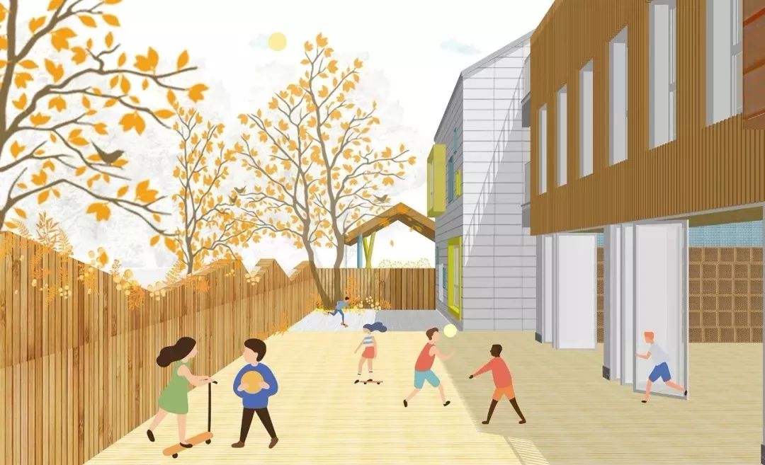 幼儿园提倡“爱与乐趣”的开放式教学理念,包含三点:会呼吸(绿色自然)、面向未来(探索精神)、无限可能(个性发展),让幼儿能充分感受到大自然的氛围与温度;让幼儿园建成后能成为一个孩子们可以自由探索的“城市村落”。