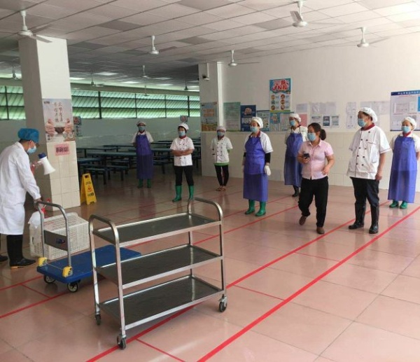 民众中学的初三学子已于4月27日顺利返校复学。为做好新型冠状病毒感染的肺炎防控工作,确保全校师生开学后的校园教学与生活安全、平稳、有序进行,4月30日,民众镇疾控中心黄良辉医生及民众社区防疫人员来到民众中学对学校食堂后勤人员、学校保洁员、学生宿舍管理员及相关工作人员进行了防疫消毒业务培训。