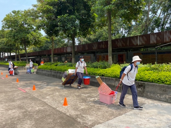 4月27日下午2点,第一批返校老师来到各自迎接返校学生的岗位,交通组、秩序维护组、消毒检查组、测温组、照看行李组按照要求有序展开工作。返校学生在老师们的引导下,按照划定通道划定点位,保持间隔1米距离进行体温检测、资料审查和物品消毒后陆续进入校园。整个过程学生之间不并排前行、不进行交谈,做到路线不交叉、人员不聚集。