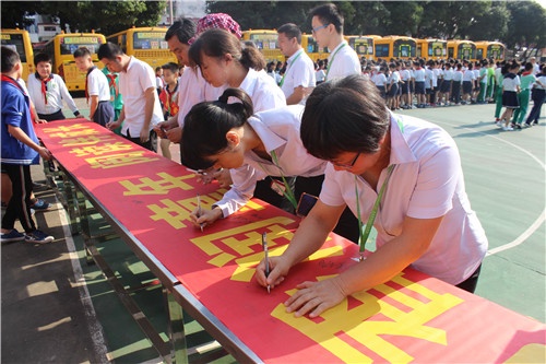 随后,刘品江副校长带领全体教师在“书香润童年 阅读伴成长”横幅上签名,各班班主任带领学生代表在横幅上签名。老师和同学们签下的不仅仅是自己的名字,更是一份承诺,一份认真读书的决心。