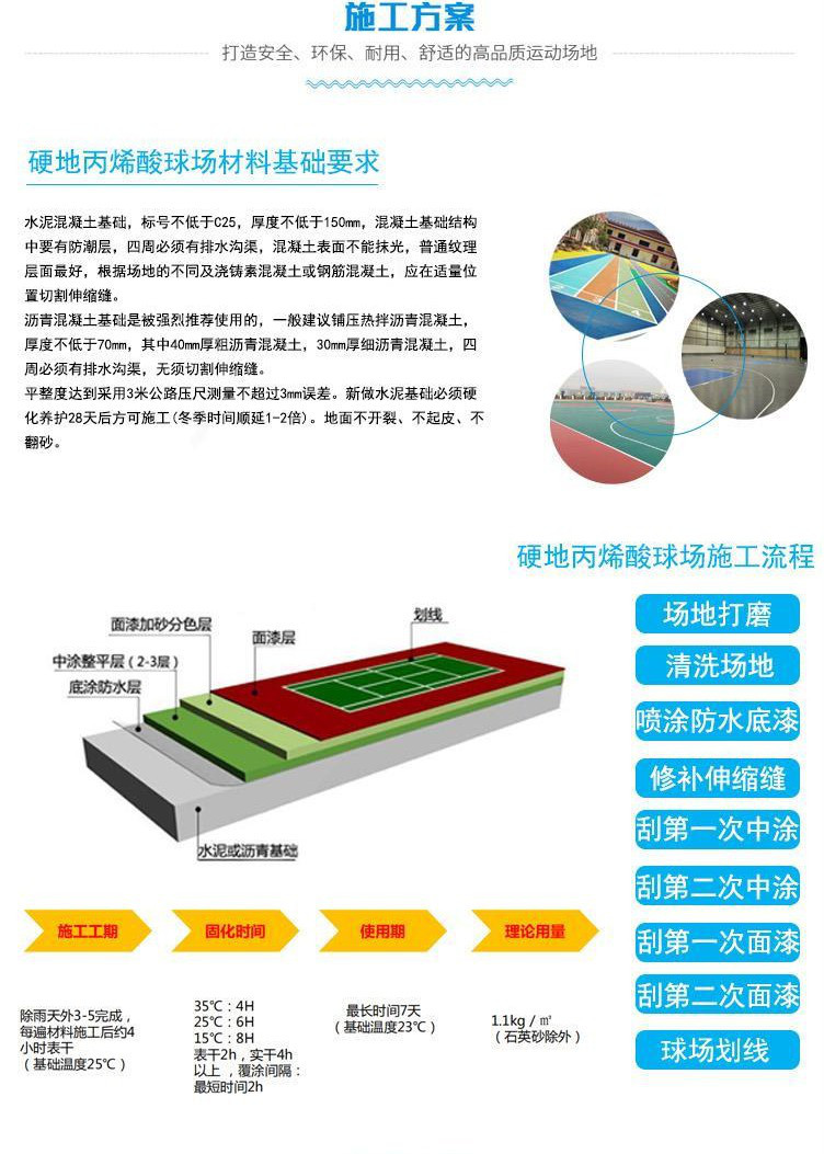 适用范围:网球场、篮球场、羽毛球场、排球场、室内外地坪,走廊楼梯,景观道路,游乐场地面。