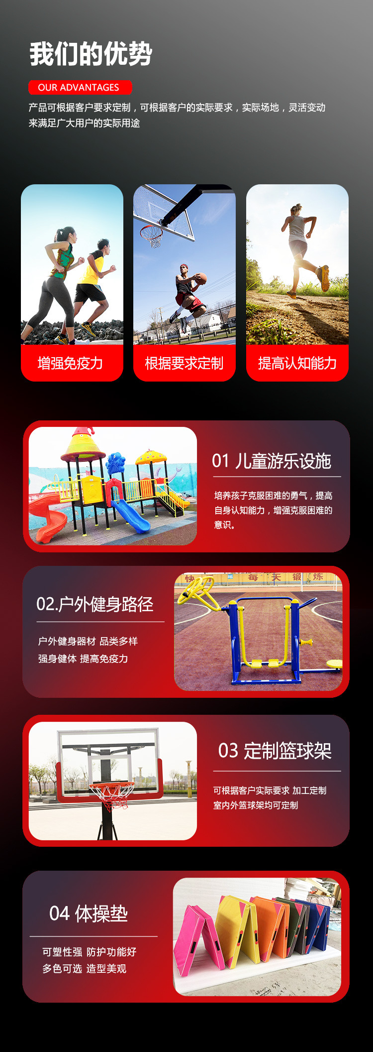 我公司主要经营各种篮球架、羽毛球、乒乓球、排球、足球、网球、体操训练器械、健身器材、塑胶
