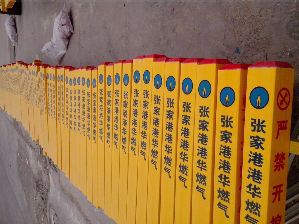 玻璃钢(PVC)标志桩安装底部设有两对穿孔,0.5直径小断钢筋呈十字交叉,灌少量水泥固定;安装步骤:1.挖30-50cm深度30-60cm方洞2.将两段钢筋插入标志桩下方对称插孔中呈对称十字交叉3.放入标志桩;燃气管道警示牌的用途玻璃钢标志牌常用于高风险地区管道安全防范事项的地面警示标志,例如隧道、大型河流、山谷、冲沟、村庄等。用于标记埋地管道的转向、管道与地面工程(地下隐蔽物)交叉、管理单位交界、管道结构变化(管径、壁厚、防护层)、管道附属设施的地面标记。常见为闹市、风景区、绿化带、灌木丛、顶管两侧管线路径指示作用。输油管道标示牌又叫输气管道标示牌、电力电缆标示牌、矿区指示标示牌、交通警示标示牌、户外指示牌等。燃气管道标志牌(管道s环)三要素1、识别s,2、介质名称,3、流向所有管道标识都必须注明识别s、介质名称和流向,这j是管道标识的基本三要素。有些管道还须注明压力、流速、温度等,危险化学品管道需要用专用危化品s环,消防管道还要注明消防专用等。