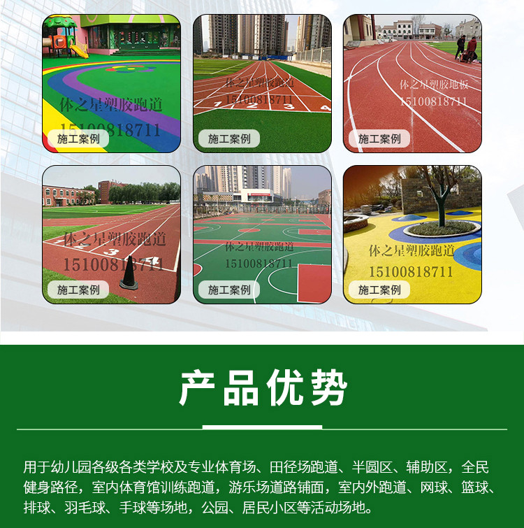 主营透气型跑道材料、混合型跑道材料、三元乙丙橡胶颗粒材料、硅PU球场材料、PU塑胶材料、预制型卷材、人造草坪TPE颗粒等