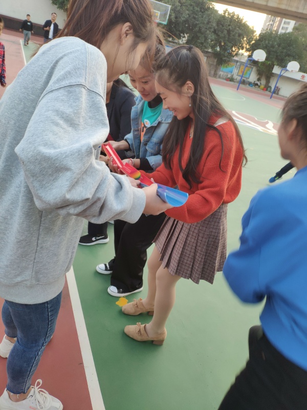 下午四点整,在祝校的组织下,八个竞赛小组整齐列队于后操场,举行了简短的开幕式。随后,主持人严老师为大家详细介绍了此次活动的具体内容与流程,并重点强调了“背靠背运球”、“投环圈”、“不倒森林”、“歌王争霸”等具体环节的注意事项。随着一声哨响,早已摩拳擦掌、跃跃欲试的“运动员”们开始了竞技大比拼。一时间,呐喊助威声此起彼伏,整个现场也随之热闹了起来:有的队员一点就通,还不忘来回给自己的队员示范;有的队员一知半解,动作也不协调;有的队员五音不全,还忘记了歌词,充当了喜剧演员,把大家逗得捧腹大笑;有的甚至忘记了裁判的存在,自顾自的玩起来……活动最后,在“自己动手、丰衣足食”的环节中,筹备组还为大家端出了精心准备的食材,老师们也纷纷摆开阵势,扮演起了“大厨”的角色,为大家带来了一场别具一格的“美食汇”。在一片欢声笑语中,本次活动也逐渐落下了帷幕。