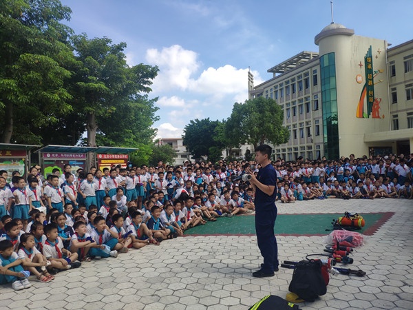 紧接着,南区消防中队的消防员在教学楼前的小广场上向师生介绍了一系列的消防装备,如氧气筒、消防防护服、液压剪、扩张器、绝缘剪、多功能水枪、灭火服、手动破拆工具组等。消防员还亲身示范这些装备的使用方法,部分学生代表学习了消防装备的使用方法,学生们在体验中增长了消防知识及技巧,强化了安全意识。